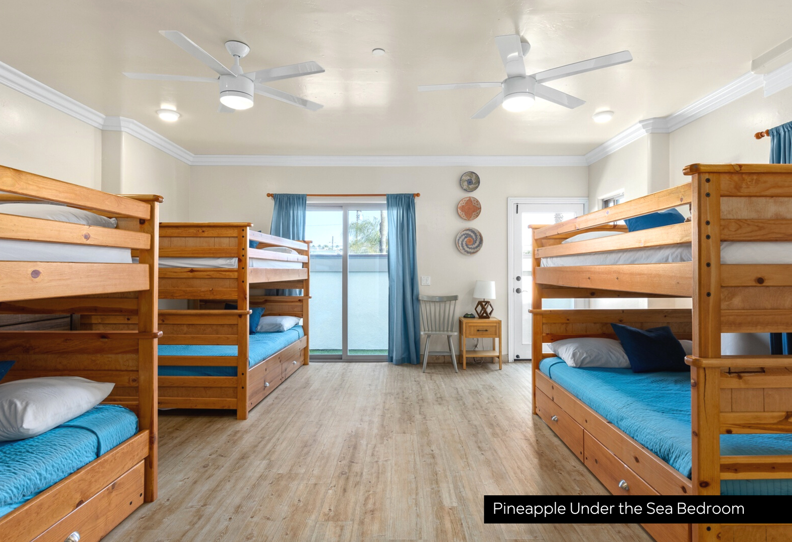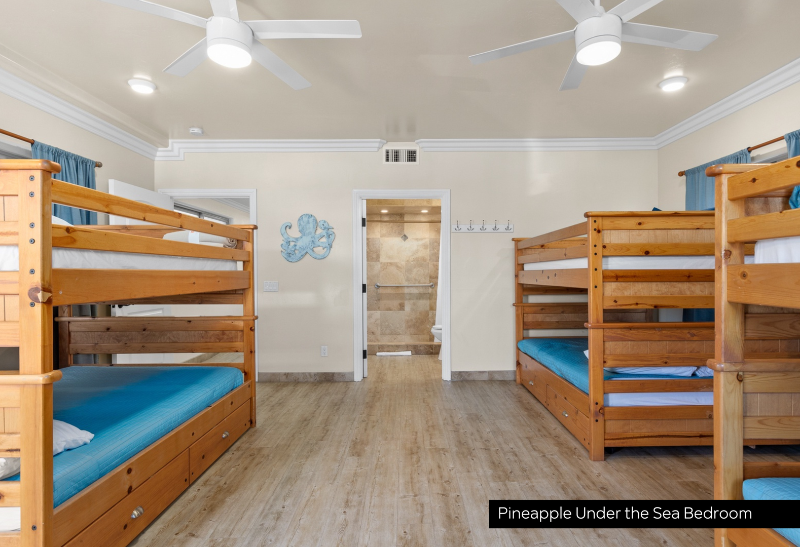 private full bathroom, ensuring privacy and relaxation for every guest. The sixth bedroom “Pineapple Under the Sea” room includes 3 full bunk beds, making it a favorite for kids or families traveling together.