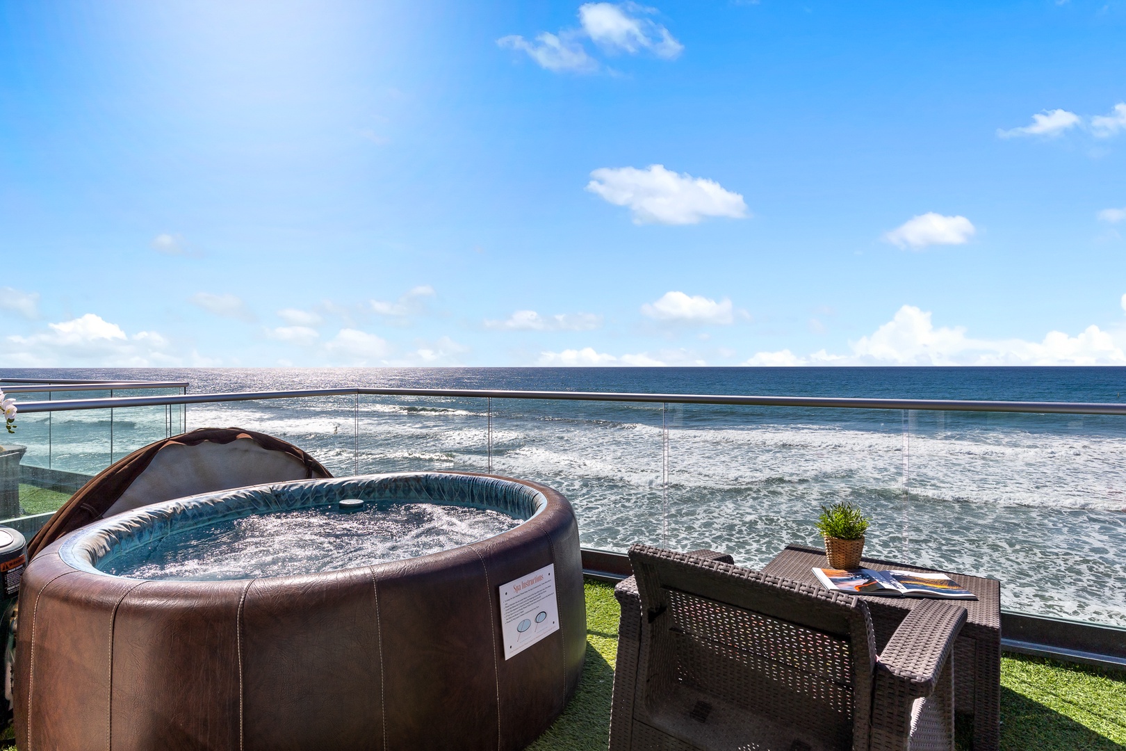 under the stars. Fire up the BBQ grill for casual outdoor dining, or unwind in the private hot tub while taking in breathtaking ocean views.