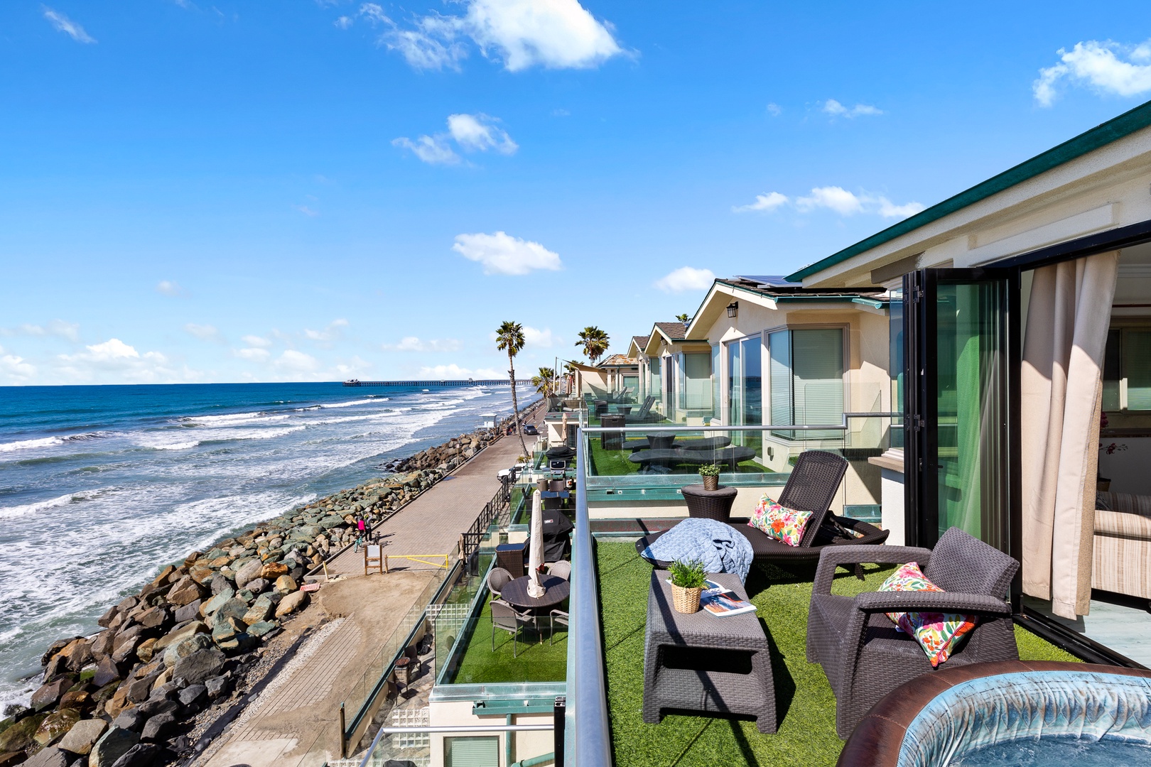 All homes in Oceanside, CA sit behind a rock barrier protecting the homes from storm surges. The amount of sand beyond the rock barrier varies quickly with storms and tides and may have more or less sand than what is shown in the photos.