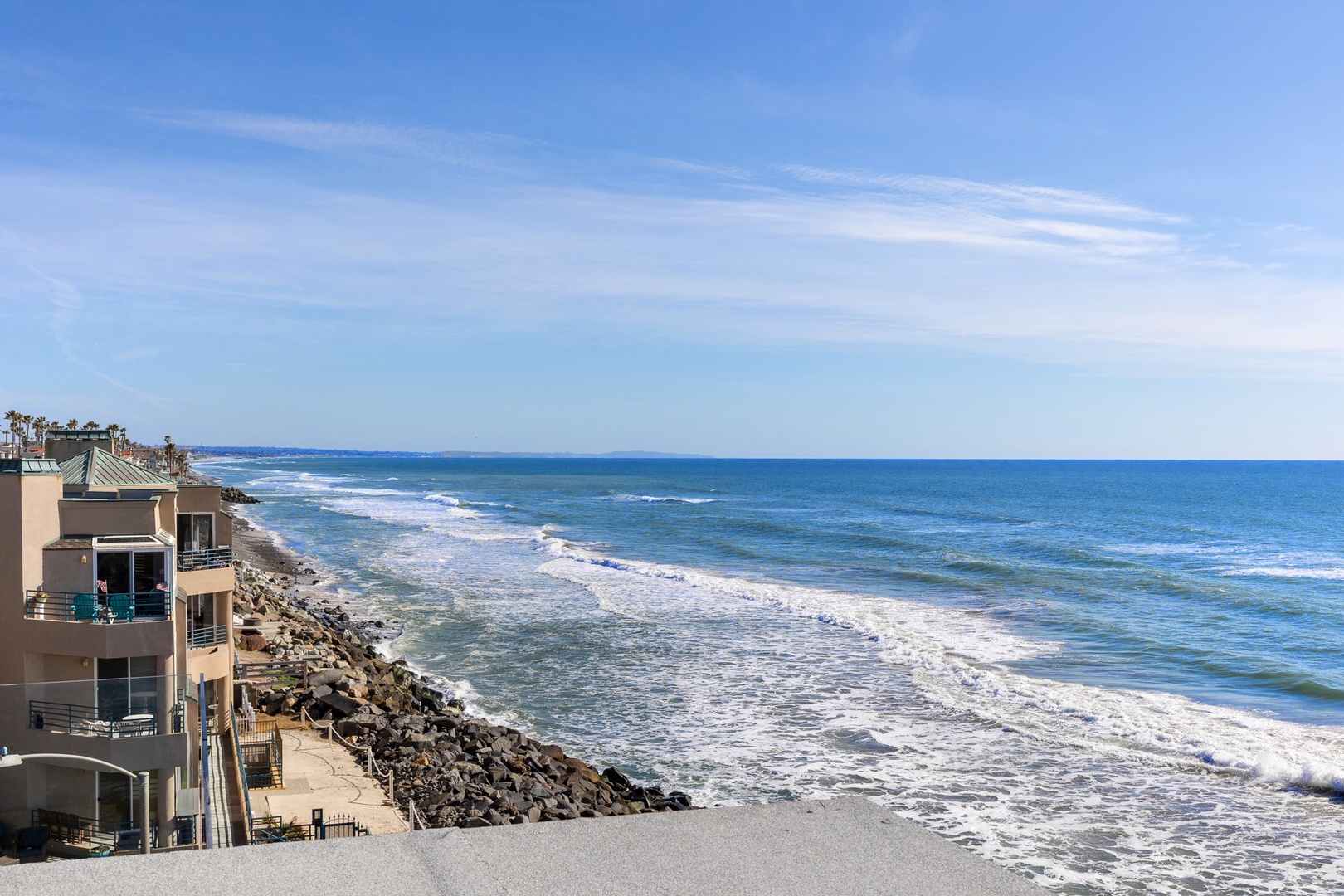 All homes in Oceanside, CA sit behind a rock barrier protecting the homes from storm surges. The amount of sand beyond the rock barrier varies quickly with storms and tides and may have more or less sand than what is shown in the photos.