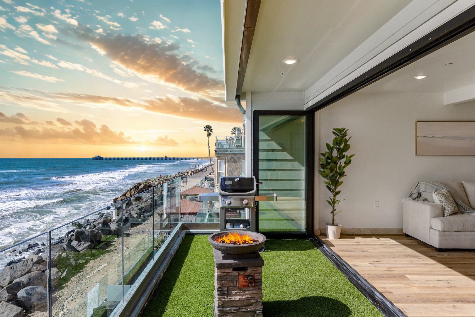 All homes in Oceanside, CA sit behind a rock barrier protecting the homes from storm surges. The amount of sand beyond the rock barrier varies quickly with storms and tides and may have more or less sand than what is shown in the photos.