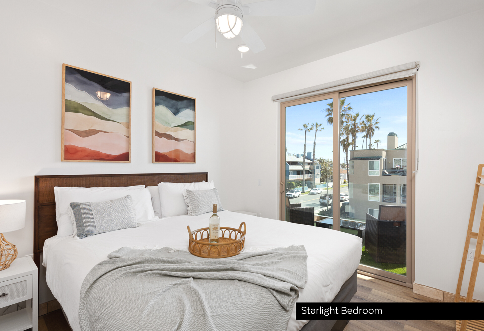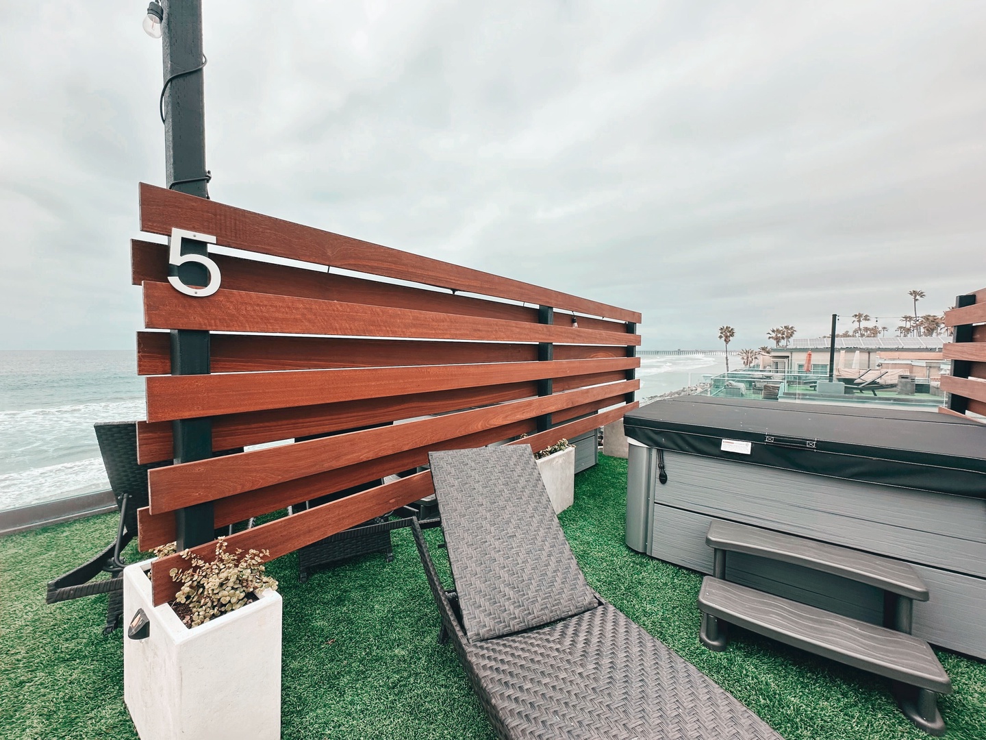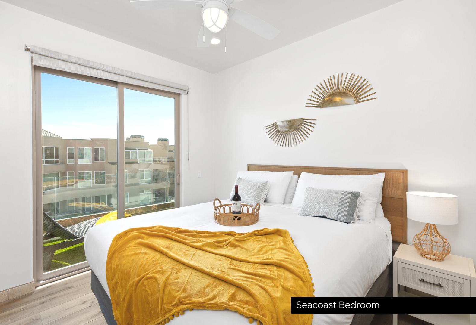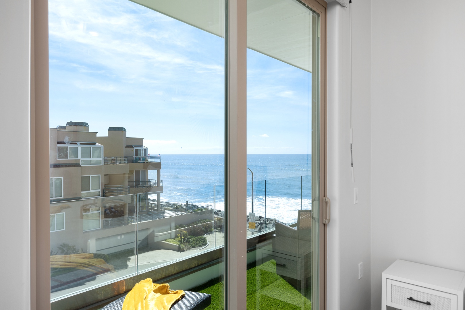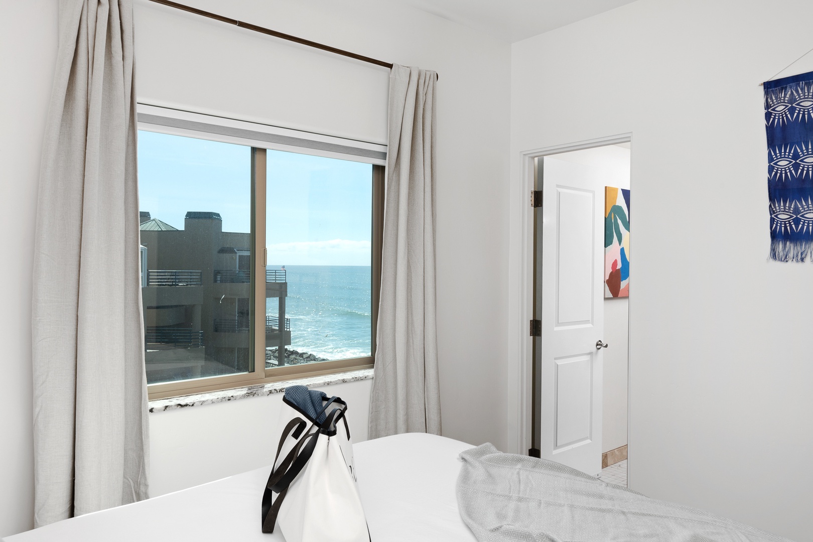 bedroom, 4.5 bathroom condo in Oceanside. Every bedroom features a king bed with a private en suite bathroom, providing comfort and privacy for all guests. The living area boasts panoramic wall-to-wall glass doors that frame stunning ocean views and fill the space with natural light, making the surf and sky part of every moment.
