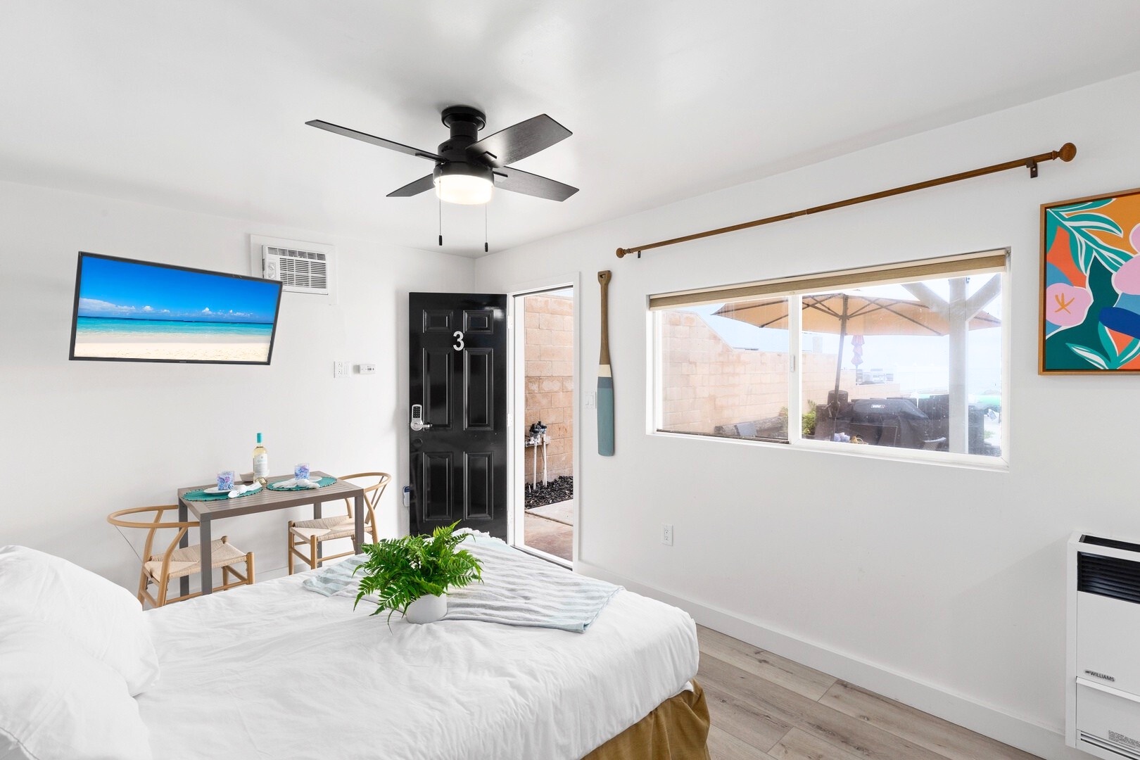 Welcome to your coastal retreat at 925 South Pacific St., Oceanside! This oceanfront studio is the perfect blend of comfort and luxury, designed for a memorable stay. Step inside to find a cozy, fully-equipped kitchen with a full-sized refrigerator, microwave, and coffee maker, ensuring you have everything you need to prepare delicious meals. The open-plan living area features a comfortable full-sized bed, ideal for a restful night's sleep after a day of exploring.