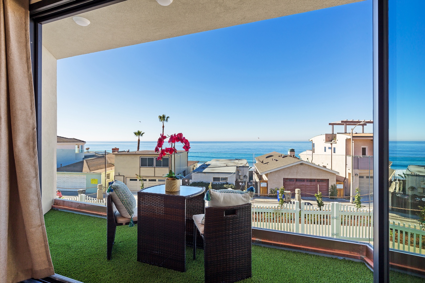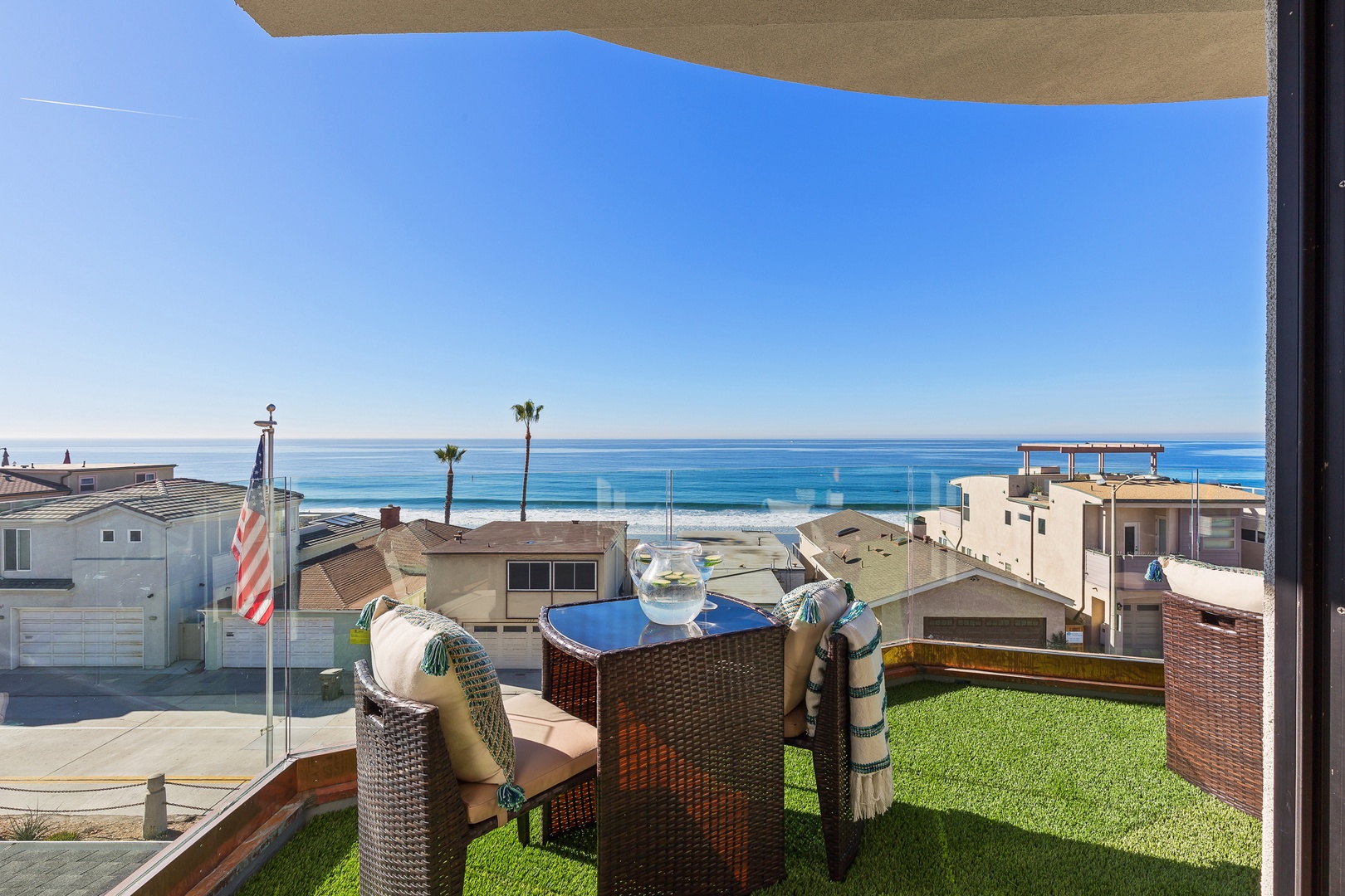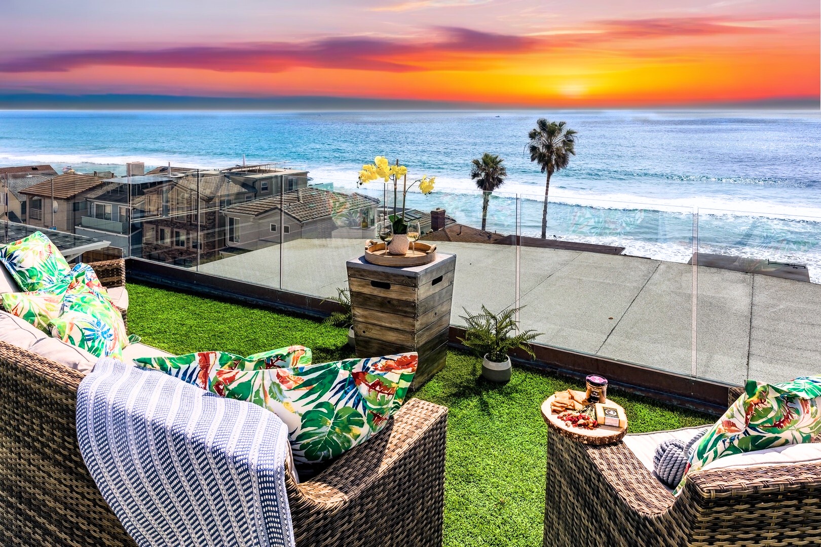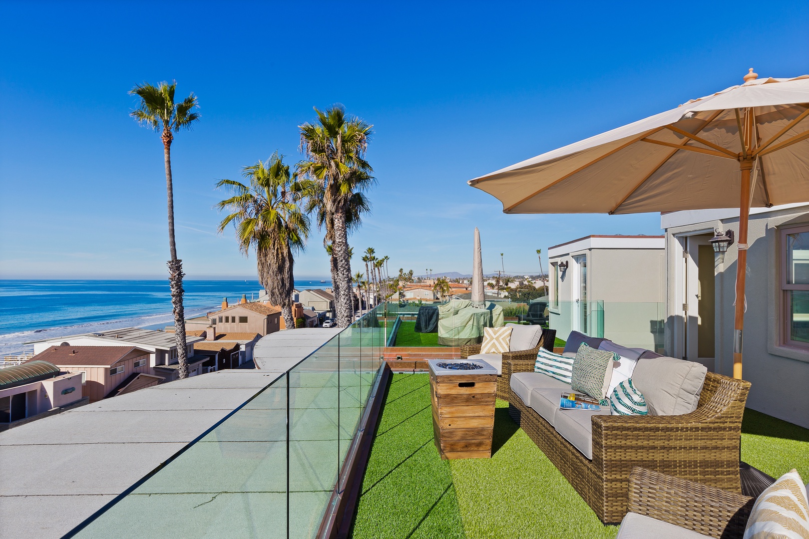 All homes in Oceanside, CA sit behind a rock barrier protecting the homes from storm surges. The amount of sand beyond the rock barrier varies quickly with storms and tides and may have more or less sand than what is shown in the photos.