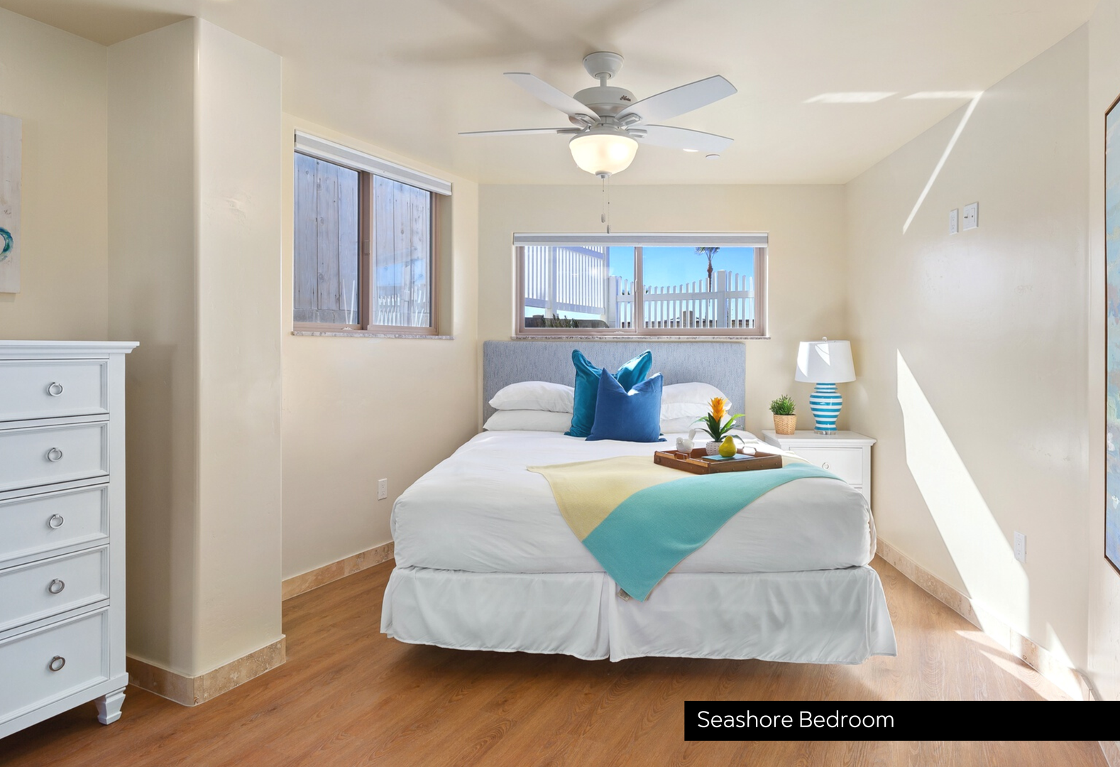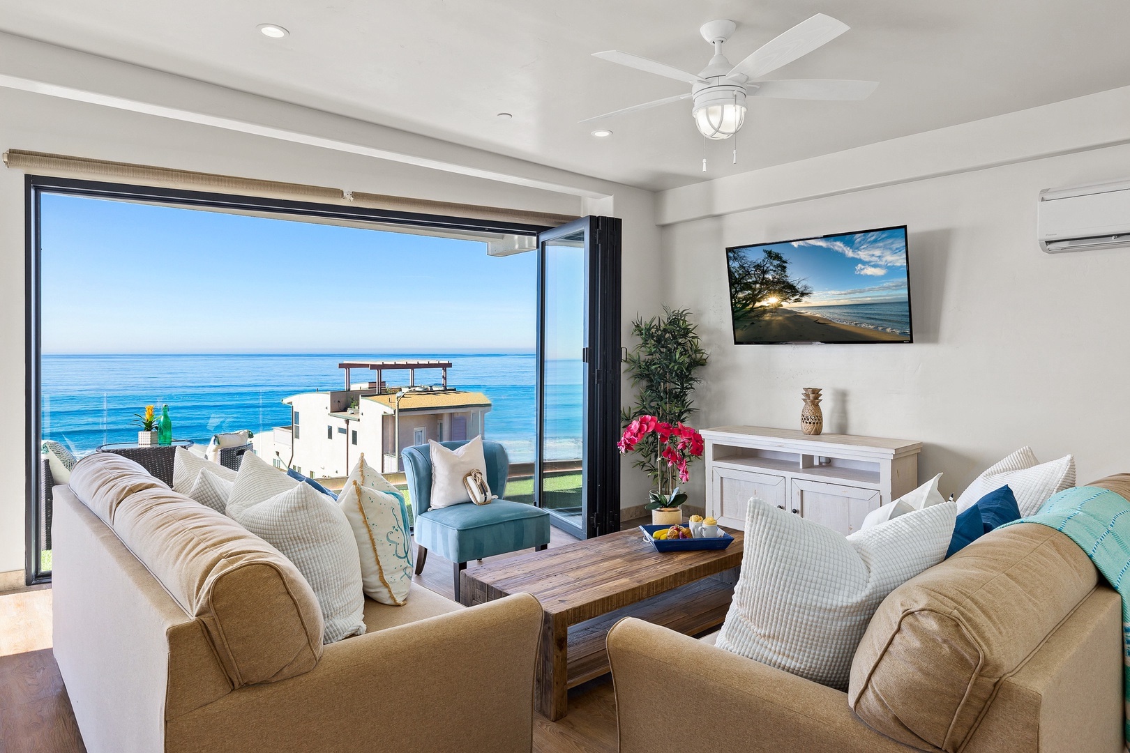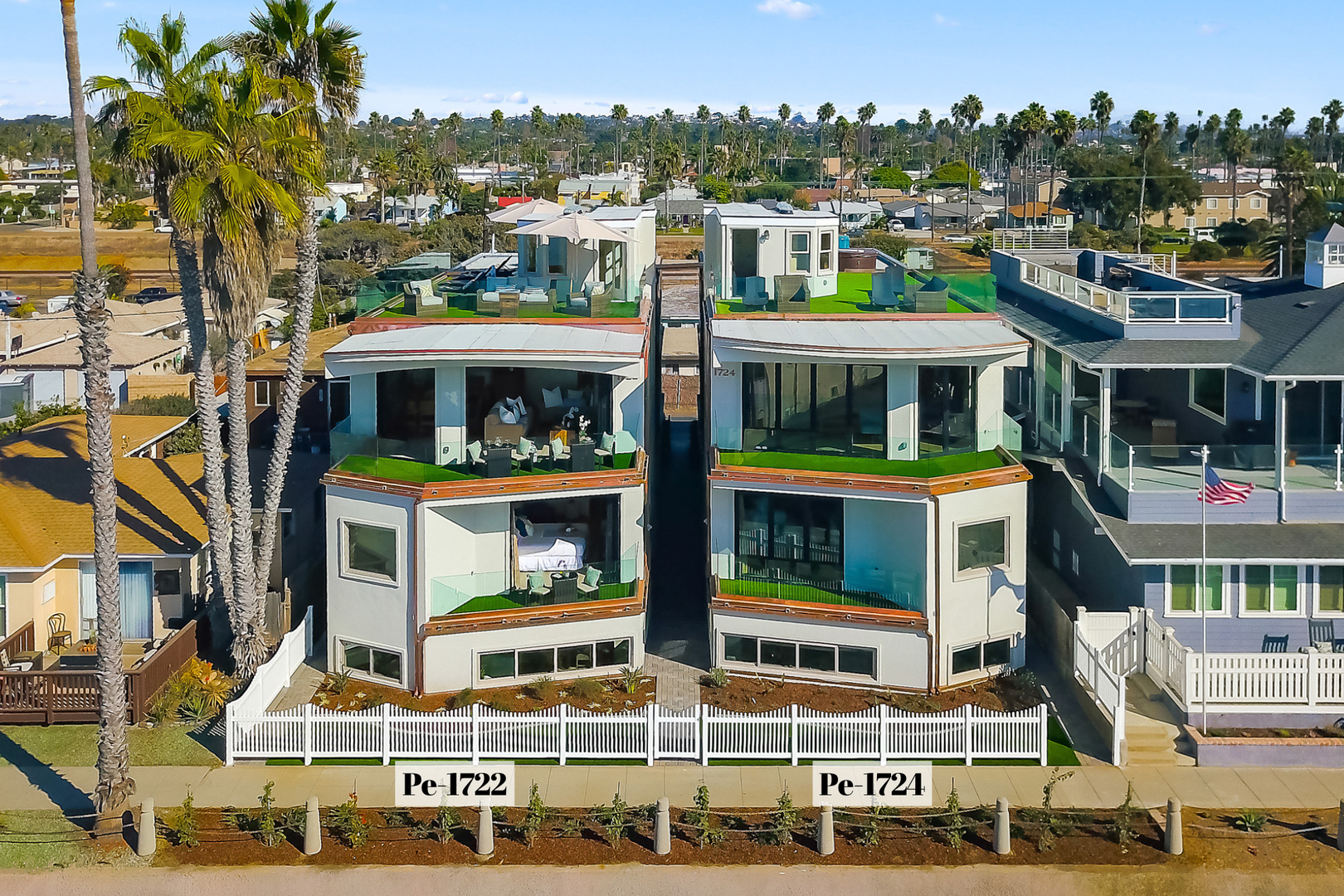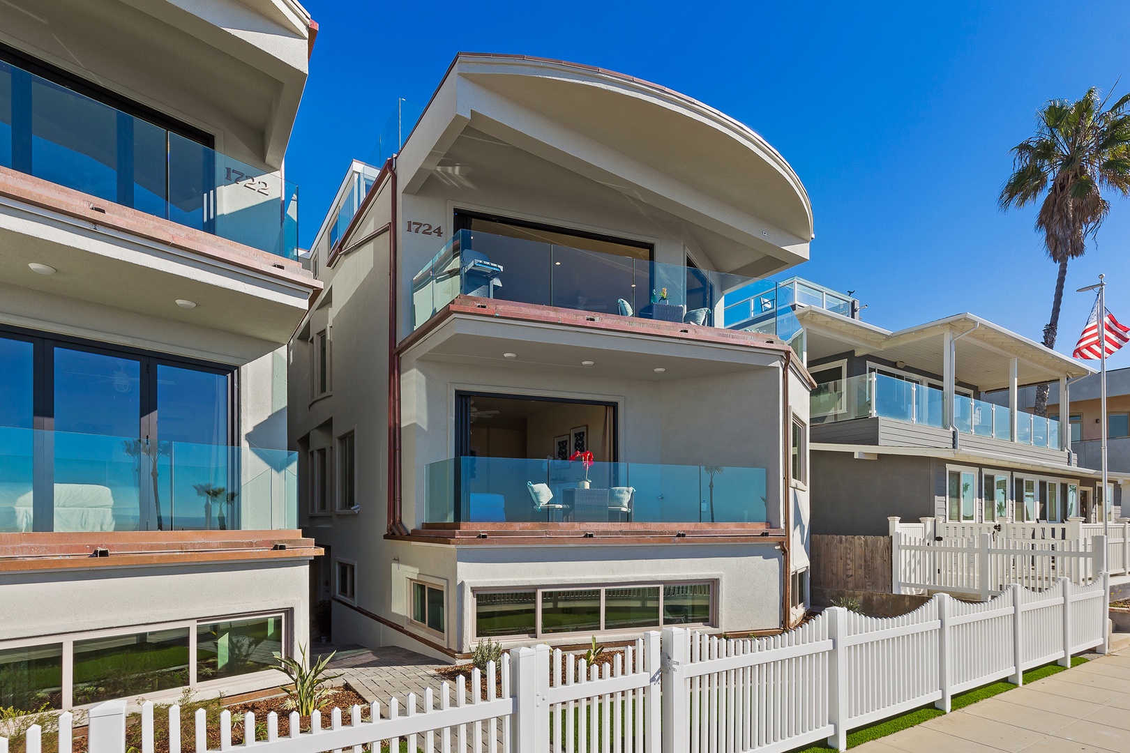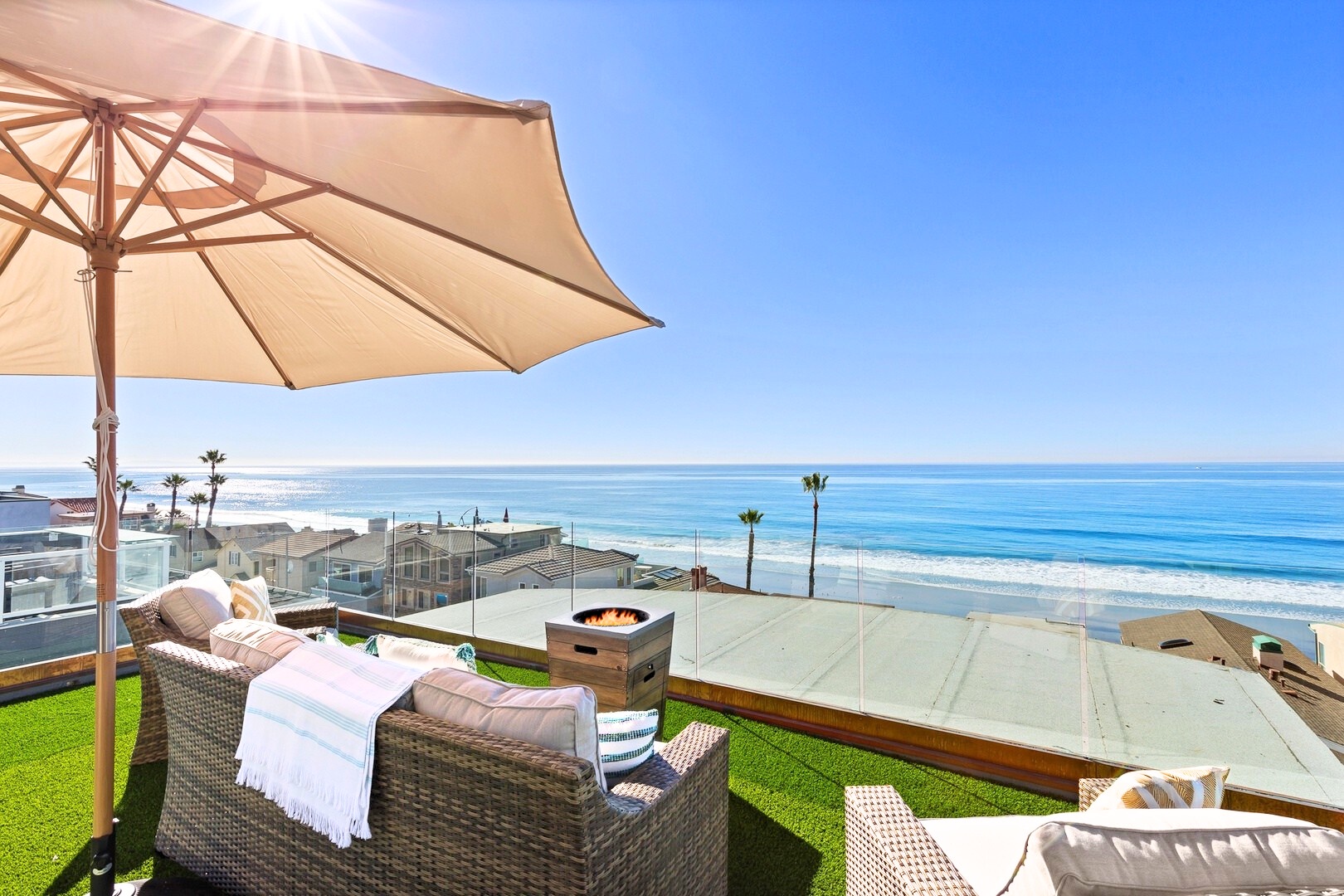 All homes in Oceanside, CA sit behind a rock barrier protecting the homes from storm surges. The amount of sand beyond the rock barrier varies quickly with storms and tides and may have more or less sand than what is shown in the photos.